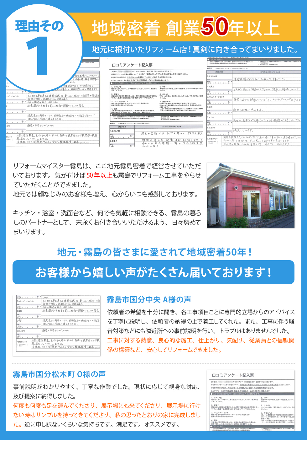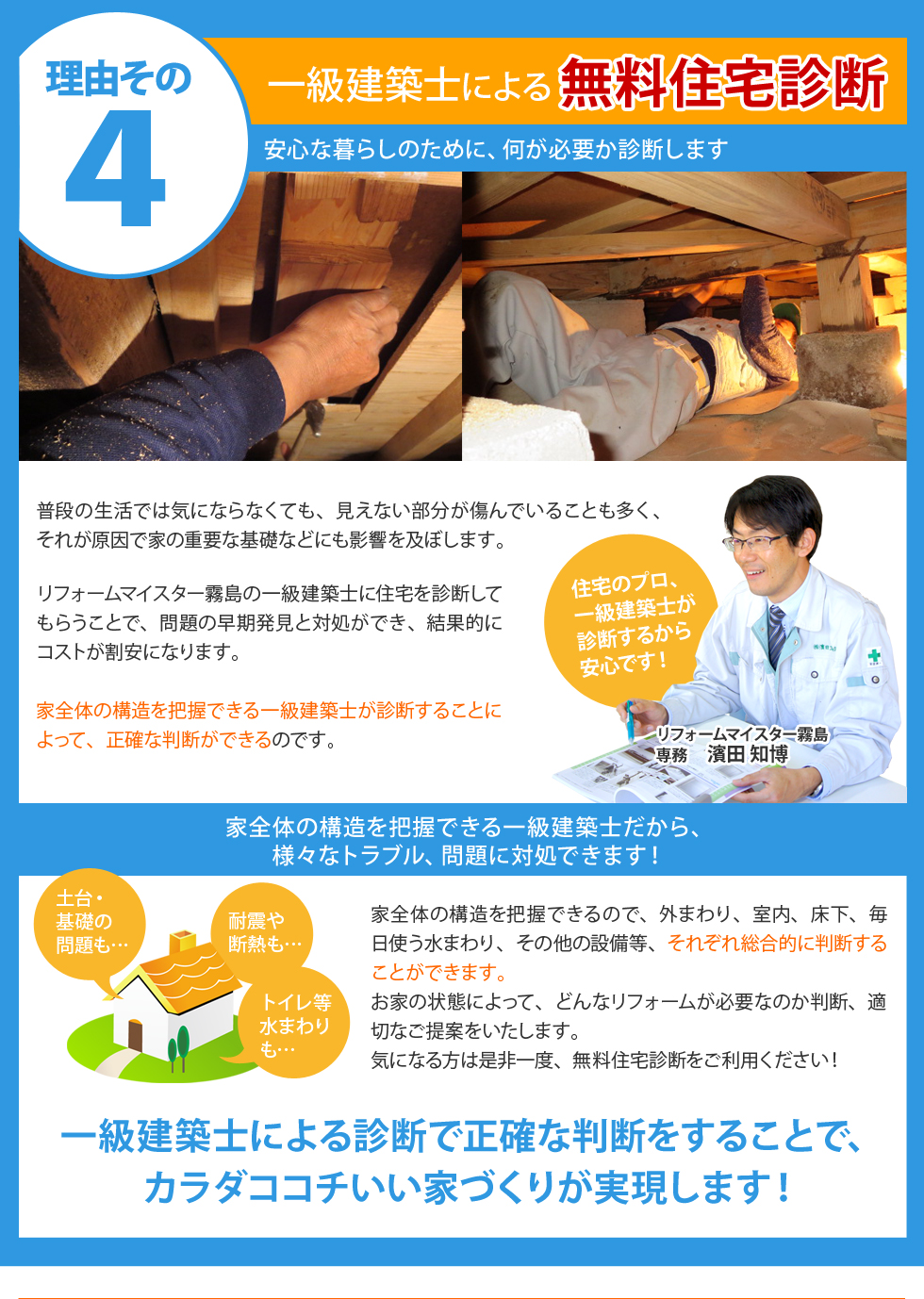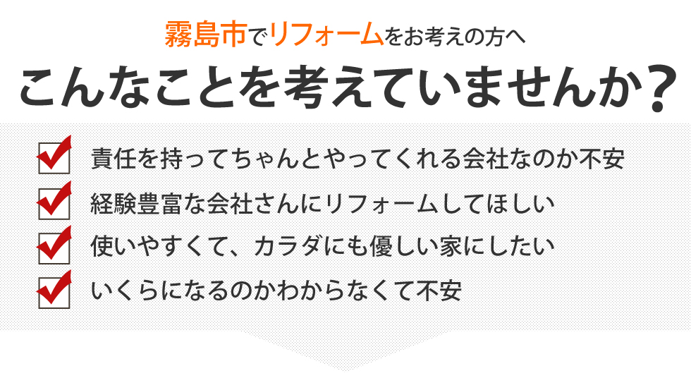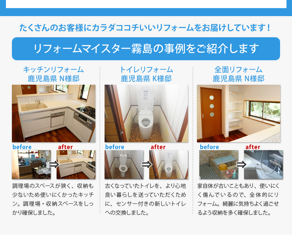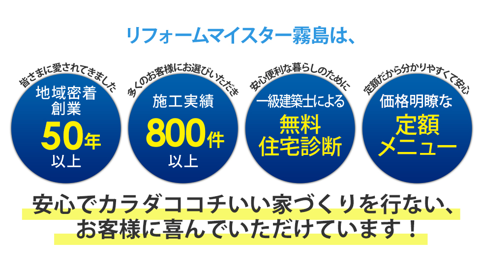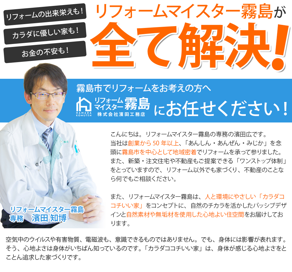 霧島市のリフォームならリフォームマイスター霧島(濱田工務店) HOME 選ばれる理由 水まわりリフォームメニュー 会社案内 施工事例 お客様の声 お問い合わせ 無料お見積もり イベント Tweet HOME はじめにお読みください HOME はじめにお読みください 会社案内 アクセスマップ 水まわりリフォームメニュー 施工事例 お客様の声 最新イベント情報 住宅診断 水まわりリフォームのポイント こだわりの建材 よくある質問 リフォームの流れ お問い合わせはこちら お見積もりはこちら イベント申し込み 〒899-4321 鹿児島県霧島市国分広瀬1丁目9-2 TEL:0995-47-0897 FAX:0995-47-0052 営業エリア 鹿児島県霧島市を中心にリフォームを行っています。 まずはお気軽にお問い合わせ下さい。 Copyright © 2016 リフォームマイスター霧島 All Rights Reserved.