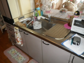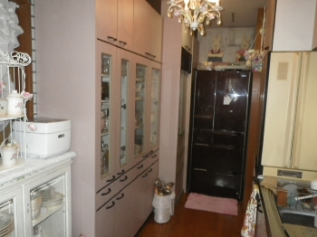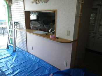 | シンクなどの水まわりでは、経年による相応の汚れも見受けられます。 | Y様邸はカウンターキッチンになっております。 こちらはリビング側より撮影したお写真です。 |