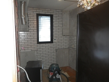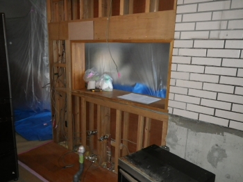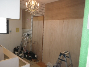 | カップボードを設置していくために、壁面の下地をボードで補強していきます。 |