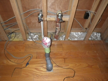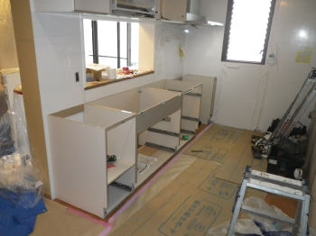 | 新しいシステムキッチン用に、給排水管の整備を行っていきます。 | 新しいシステムキッチンを運び入れ、設置を行っていきます。 |