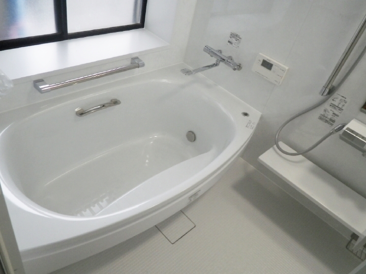 | こちらはユニットバスの施工後のお写真です。 湾曲した浴槽が身体にフィットする、疲れも吹っ飛びそうな素敵な浴槽ですね。 |