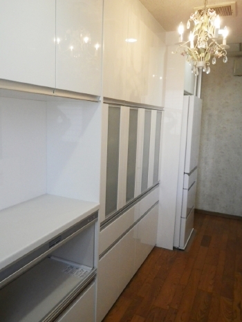 | こちらはキッチン背面、カップボードなどの収納を撮影したお写真です。 | 手前に見えますのは、スライド式の炊飯器を収納できるスペースになります。 |