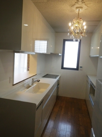 | こちらがキッチン施工後のお写真です。 豪華なシャンデリアにも負けない、高級感のあるキッチンにリフォーム完了です。 |