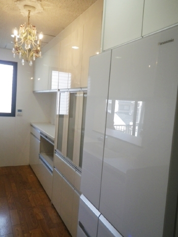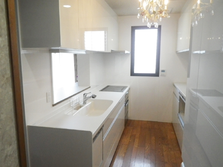 | 全体を撮影したお写真です。 真っ白なキッチンが、空間に清潔感を与えます。 |