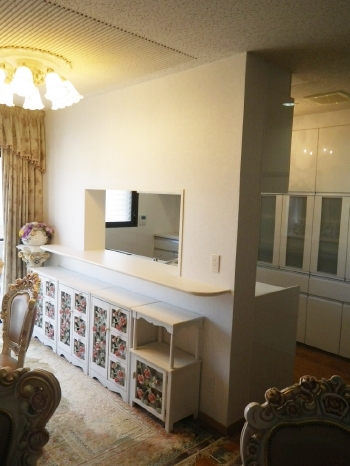 こちらはリビング側より撮影したお写真です。 真っ白なキッチンに合わせて、内装も統一感ある雰囲気にリフォームされました。 |
