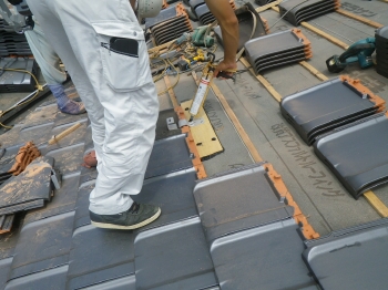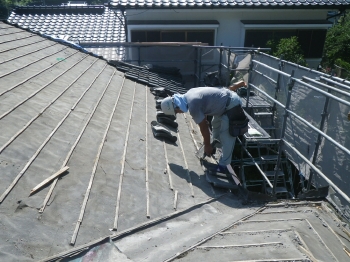 | 瓦と桟木を撤去したのち、ルーフィング材を敷きこんでいき、万が一の雨漏り対策を万全に行います。 | ルーフィング材の上から新規に桟木を設置していきます。 |
