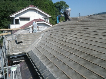 | お家の周りにぐるりと足場を掛け、まずは既存の瓦を撤去していく作業から行っていきます。 | M様邸は大きなお家で屋根もとても広いため、職人が何人も屋根に上り撤去作業を行っていきます。 |