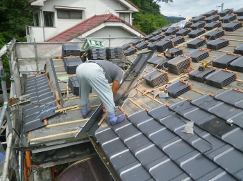 | 屋根の上へ瓦揚げ作業が完了いたしました。 | 一枚一枚丁寧に、瓦を葺いていきます。 |