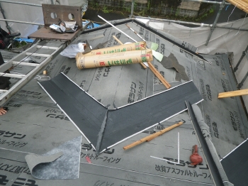 | 谷板金を取付けていきます。 | 谷部の境も隙間が出ることのないよう、加工した瓦を使い葺いていきます。 |