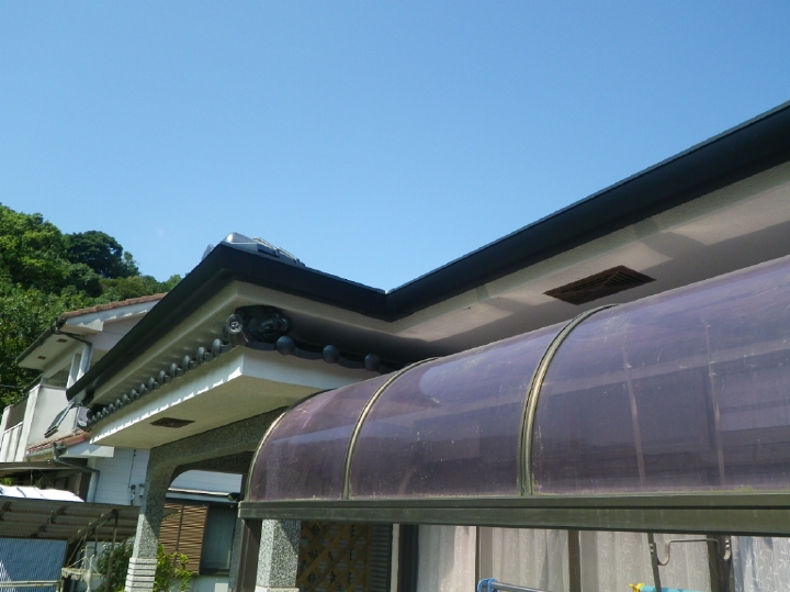 | 谷部板金もご覧の通り、きれいに仕上がっております。 | 今回の葺き替えリフォームでは雨樋も併せてお取替えしております。 |
