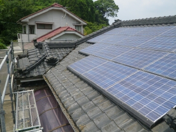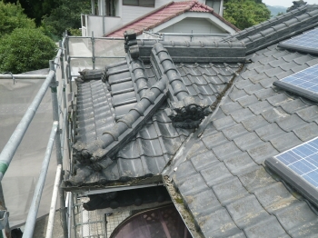 | こちらが施工前のお写真です。太陽光パネルが設置されている瓦葺きの屋根でした。 | 経年の劣化により、屋根の谷部などには痛みが見られました。 |